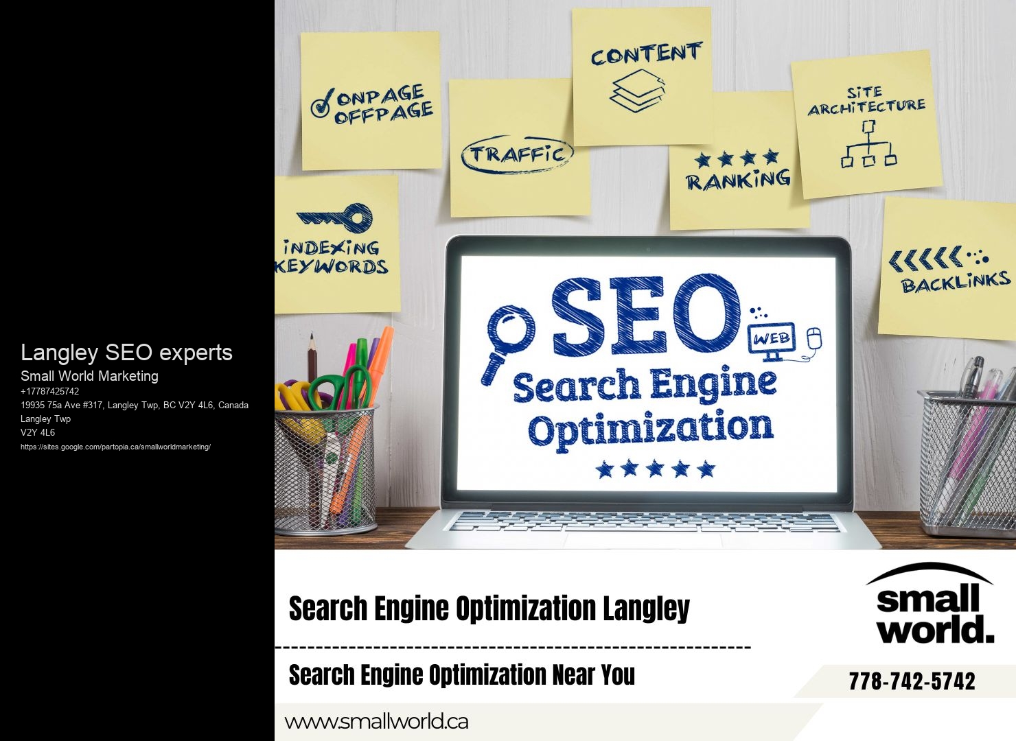 This journey into the digital unknown promises not just insights but actionable strategies that could redefine your business's online presence. Learn more about Langley SEO specialists at Small World Marketing here. Plus, they don't stop at getting you to the top; they also work on keeping you there, constantly adjusting strategies to reflect changes in search engine algorithms and local market trends. This isn't just about making your site look good on a smaller screen; it's about ensuring that it loads quickly, is easy to navigate with one hand, and that all features work flawlessly on touchscreens. Learn more about Langley SEO experts here In essence, SEO not only enhances your website's visibility but also contributes to a better understanding of your market and an improved customer experience. That's why our services are designed to be dynamic, adapting to new trends and algorithms to keep your business visible and relevant.